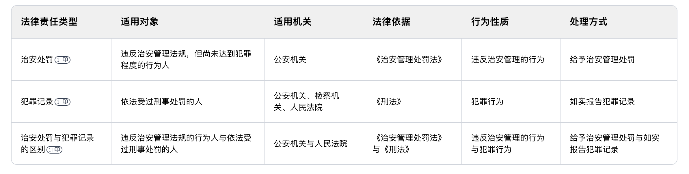 治安管理处罚是针对违反治安管理行为但尚不够刑事处罚的行为,由公安机关依照《治安管理处罚法》给予的行政处罚。犯罪必须具有严重的社会危害性,“ 情节显著轻微危害不大的”行为,不能构成犯罪。治安处罚与刑事处罚是两种不同的法律责任承担方式,不应混同。因此,治安处罚不构成犯罪记录。